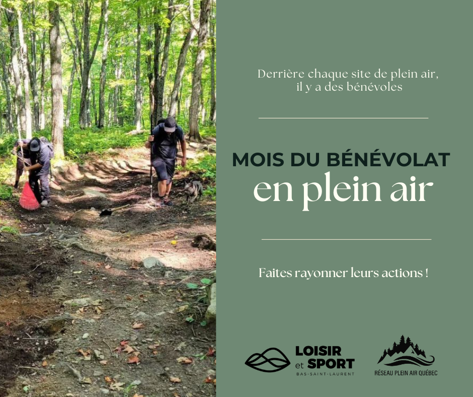 Dans le cadre du Mois du bénévolat en plein air, Loisir et Sport Bas-Saint-Laurent souhaite valoriser les actions bénévoles qui contribuent à la vitalité des lieux de pratique.
